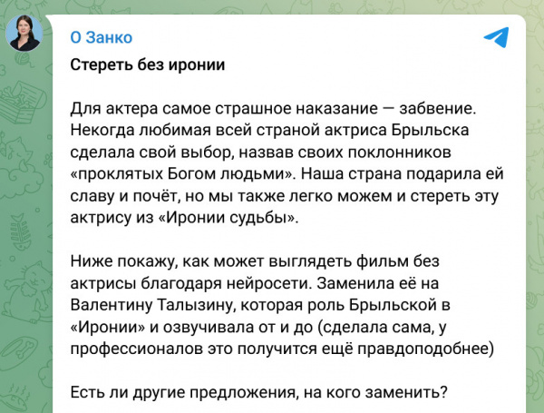 Ну и, конечно, на это немедленно откликнулась какая-то рашистка-депутатша 1990 года рождения. Ее страна, говорит эта Занко, подарила Брыльске славу и почет, поэтому ее теперь нужно стереть из "Иронии судьбы". Это какая такая ее страна подарила Брыльске славу и почет? Мордорстан? А Брыльска об этом вообще в курсе?