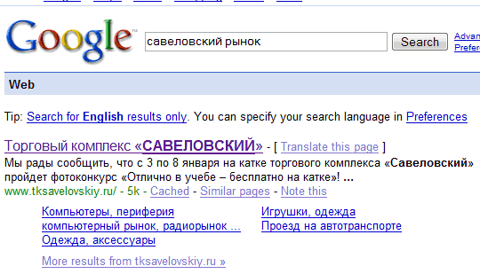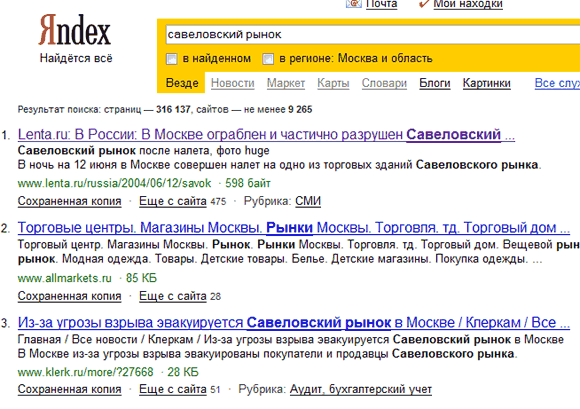 Искал сайт савеловского рынка - хотел узнать, работает он сегодня или нет. Ввожу в Яндексе "савеловский рынок". Получаю вот это: