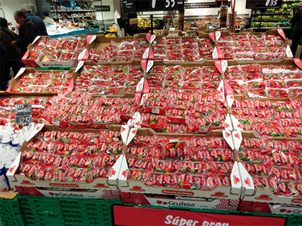 Эта клубника с самого Юга Испании из города Палос де ла Фронтера, провинция Уелва. И это не совсем клубника а называеться Фрезон, типо Клубничище. Они зимние и не сладкие не очень вкусные, но очень большие по размеру. А самая вкусная клубника в Испании выращивается в двух городах как раз на холмах Калельи и особенно много в соседнем Сан Поль де Маре. Она появиться первая в Апреле и до Июня. Она дороже и её не много, не во всех магазинах есть. вернее будет.
