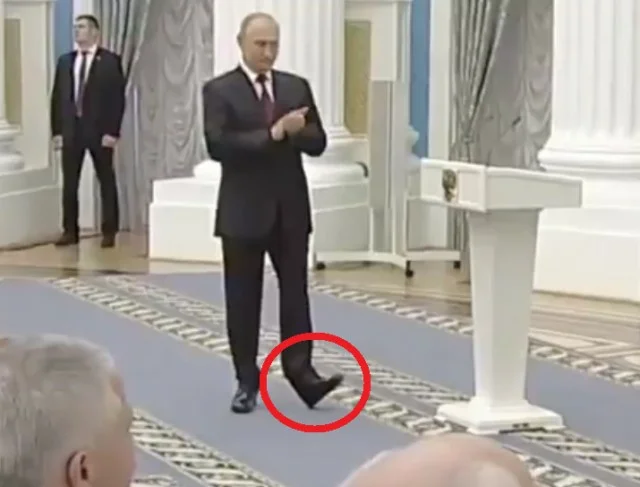 Приплясывает на месте, как обычно. У него же туфли со скрытым каблуком для увеличения роста, не очень удобно в таких стоять на одном месте, вот и переминается он с ноги на ногу постоянно.