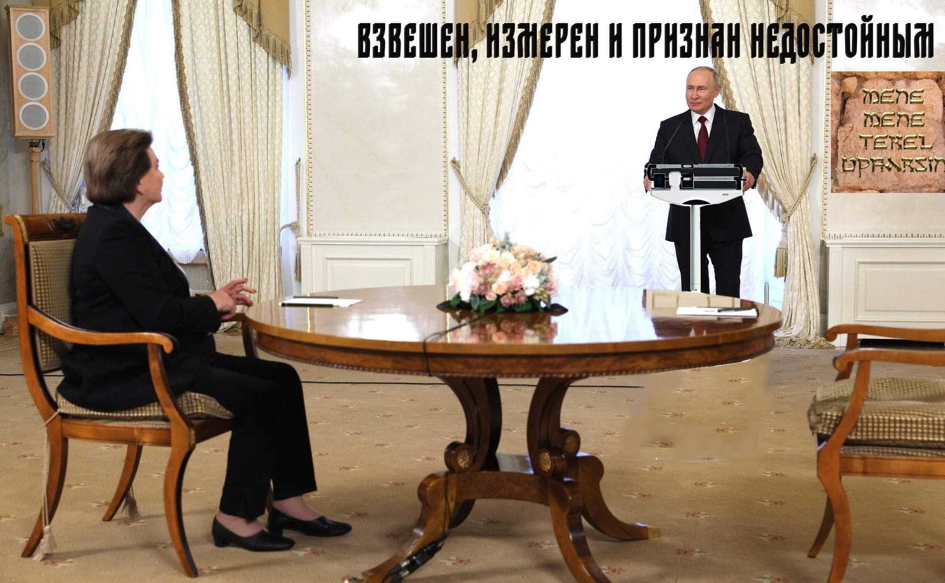 Вы знаете, после ея громогласной речи в думе, с предложением о перезапуске президентства я ее никак кроме как старой космической пи#дой не называю. Так что фото можно назвать "старая космическа пи#зда на аудиенции у х#йла". Теперь это можно перерисовывать на лубки и вешать на стены. Меж медведей с балалайками и иконами.