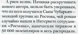 Прям такие трогательные истории рассказывают, куда деваться. Вот прям так и нашли молодого грузчика в Интернете, издали сразу 50000, все распродали и теперь Чубарьян - number one. Чушь несусветная. Текст книги Чубарьяна издатели "Росмэна" действительно могли найти в Интернете - он там первый раз появился, насколько я помню, не один год назад. А вот с его изданием "Росмэн" пошел на чистый эксперимент: они вбухали очень серьезные деньги в рекламу этой книги (я не всю рекламную кампанию знаю в подробностях, но даже то, что я видел - тянуло не на один десяток тысяч долларов), а хваленые 50000, насколько я помню, то ли вообще не распродались, то ли распродались с большим скрипом.