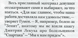 То есть Гумен болеет за "Зенит", поэтому больше ни одна книга, посвященная спартакам, цска и прочим динамо - никогда не пройдет. Еще ее в детстве укусил брюнет, поэтому авторам-брюнетам к ним дорога заказана. А если автор еще и жует жвачку - ему в этом литературном агенстве нечего делать просто по определению! Высокие профессионалки там работают, высочайшие!