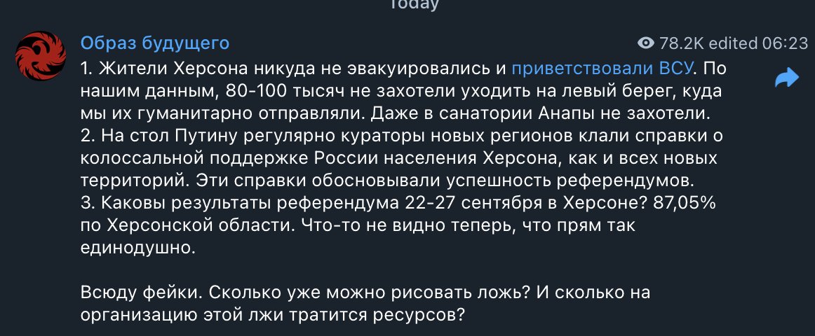 Также рекомендую хороший материал Надежды Мазакиной в "Фонтанке" о том, кто, что и как говорили о Херсоне на российском ТВ - "Сжимать зубы и уметь завалить хлебало эмоций. Что в России думают об уходе из Херсона".