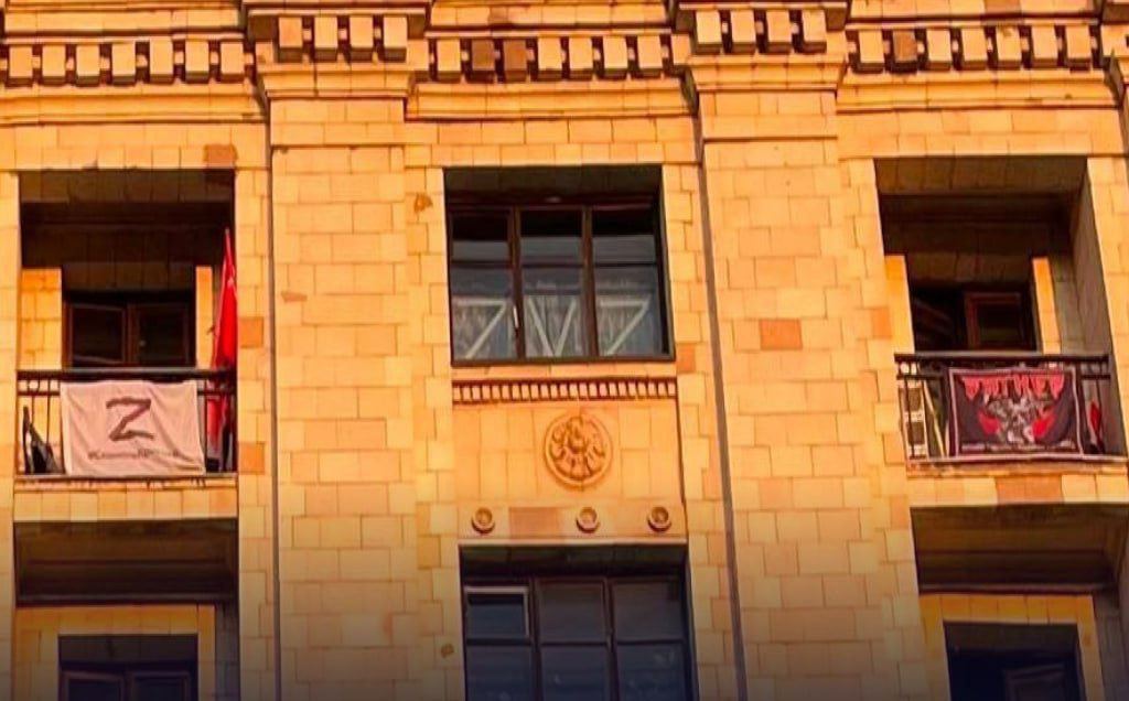 повесили вроде собственники здания, через какое-то время по жалобе жильцов сняли. сейчас опять висит, теперь уже трёхцветная на белом......