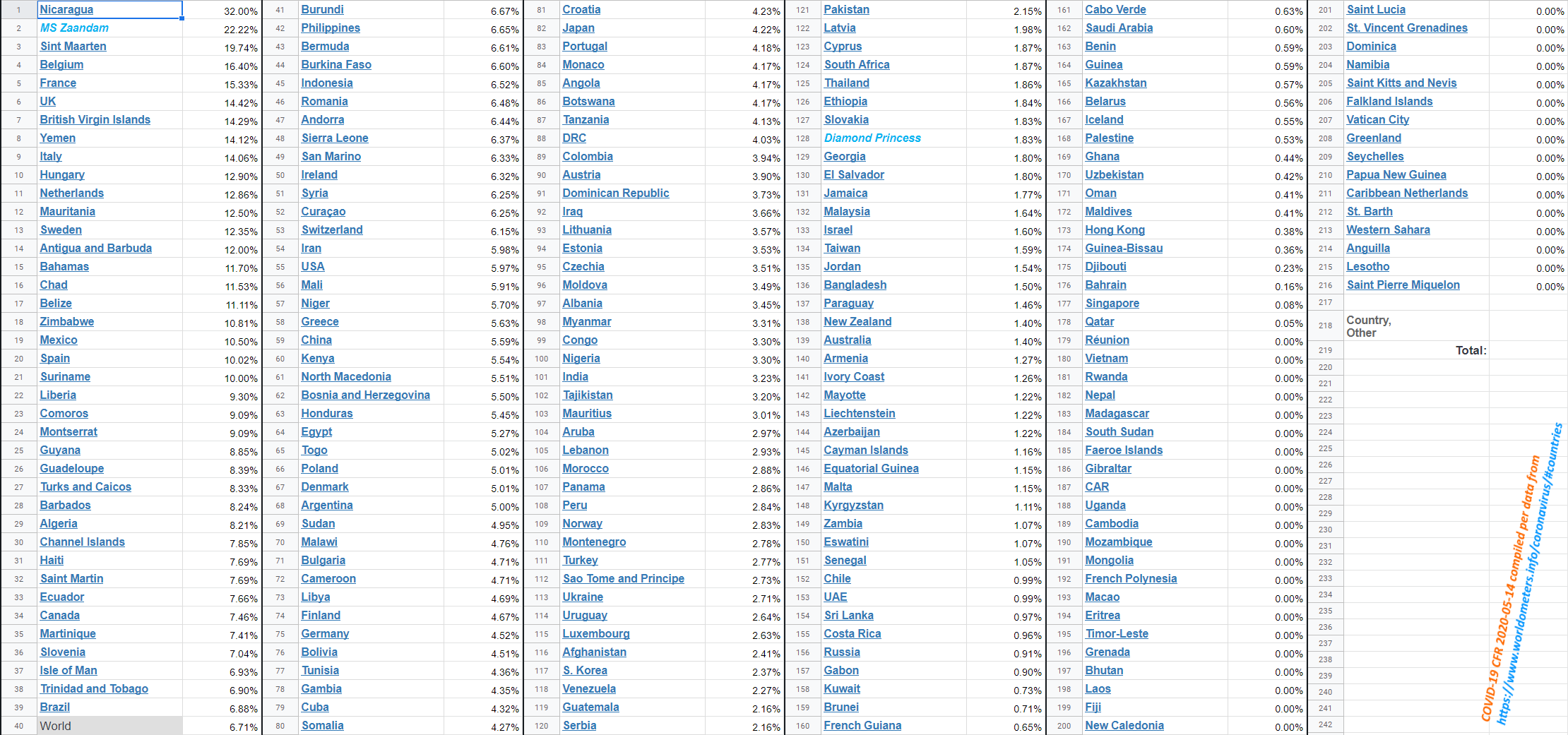 Ваш оппонент говорит о летальности вируса – процентном соотношении количества смертельных исходов к количеству заражений. В таблице этот показатель прямо не прописан, приходится высчитывать самостоятельно (именно эти расчёты вам и показали выше).