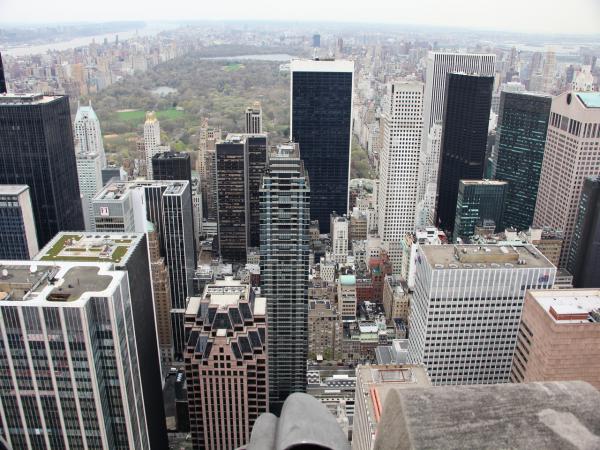 Снимал с крыши "Рокфеллер-центра". У них это называется "Top of the rock". То есть сначала идет "30 rock", а потом "Top of the rock", то есть 65 rock. За билетиками можно долго стоять в живой очереди, а можно купить в киоске на улице на определенное время. Мне досталось на через полтора часа. Погулял по городу, пообедал, пришел к назначенному часу - прошел за две минуты. С погодой, правда, не повезло - сплошные тучи. Но все-таки что-то поснимал. Там система интересная. Ограждение на крыше - из толстенного стекла. Снимать было бы невозможно, однако между стеклянными панелями есть щели толщиной примерно в объектив. Так что можно хоть что-то зацепить. Ниже оно, зацепленное, и представлено. (Кликабельно, как обычно.)