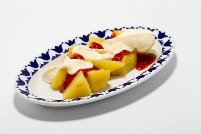 Вообще звучит очень забавно. Дело в том, что пататас бравас - это просто обжаренные во фритюре (или на сковородке, или просто вареные) куски картошки с томатным соусом и обильно политые майонезом. Блюдо простое, как две копейки, не слишком вкусное, но при этом в Испании почему-то очень популярное.