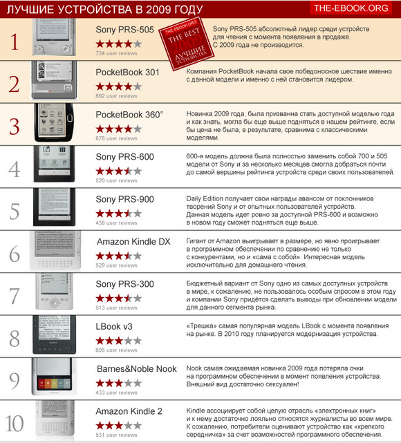 На сайте The-Ebook опубликована табличка "Лучших ридеров 2009" года по версии самого сайта. Что интересно, с первой пятеркой я согласен просто один в один - точно так же бы расставил.