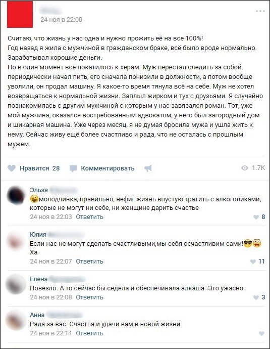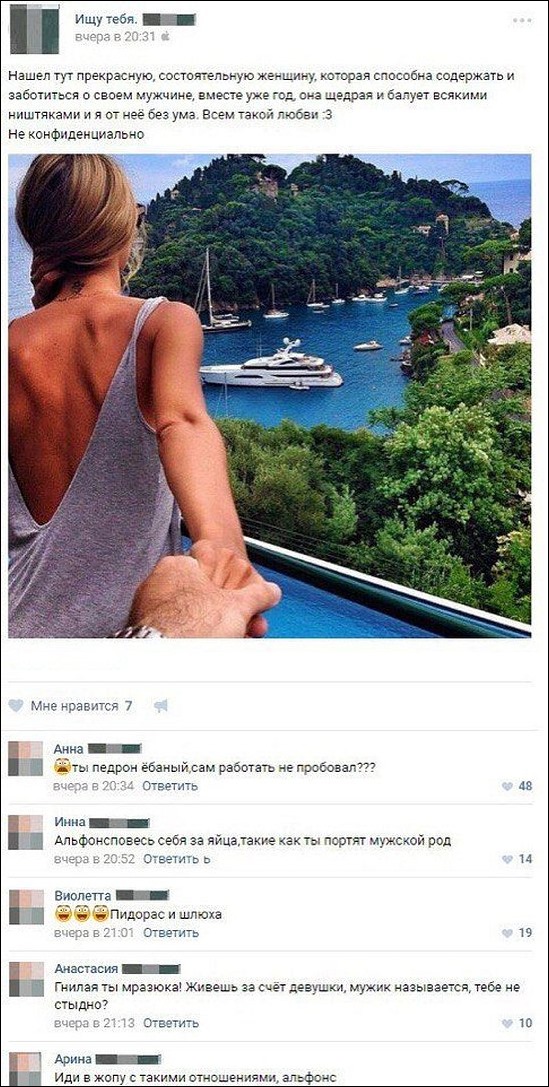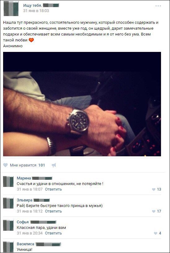 Ну из правды только то что мне кажется мужчина должен быть скромнее в рамках таких отношений и не демонстрировать особо. Ну пост в общем-то в нормальных пределах в плане выражения своей радости. На особую роскошь парень/мужчина должен сам зарабатывать и не садиться на шею. А женщины если и могут позволить себе чуть больше в этом плане то должны быть меньшими хищницами.