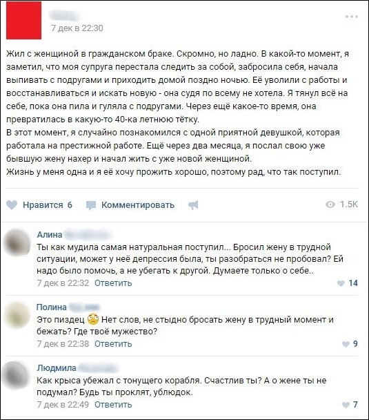 Но только всё, что традиционная мораль требует от женщины, с негодованием отвергается такого рода публикой как архаичное, устаревшее и унизительное, а всё, что эта мораль требует от мужчин, по-прежнему считается актуальным и обязательным