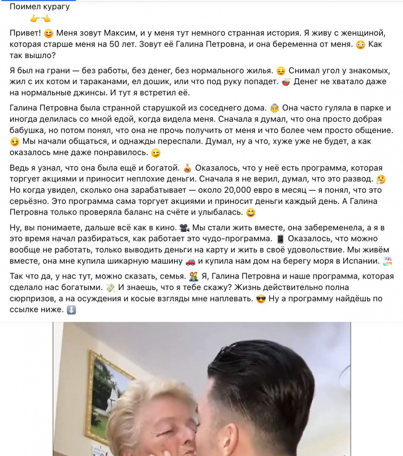 это ещё фигня - на тиндере и ко сидят кучи таких разводил, которые будут неделю тебя обхаживать, спрашивать как тебе дела, что тебе сегодня снилось и слать (ворованные у кого-то с инсты) фотки. А потом они расскажут, что приторговывают на фондовом рынке, да не сами, а с помощью какого-то дяди, тёти, свата, брата, у которого целый финансовый департамент (очень любят это слово), в котором сидят эксперты 24/7 и просто говорят тебе, что покупать и что продавать. Ну и ты типа такой должен заинтересоваться. Меня одна такая две недели обхаживала.
