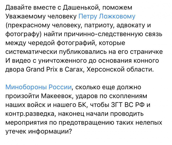 Прикольная история. Есть такой великий русский воин-освободитель, патриот, адвокат и фотограф Петр Ложковой. Он активно бухает воюет в Украине и очень любит публиковать бравые фотографии себя, любимого, в соцсетях. Вот, например, воинственный Петя на базе отдыха Grand Prix в оккупированном селе Правые Саги Херсонской области.