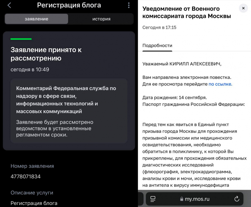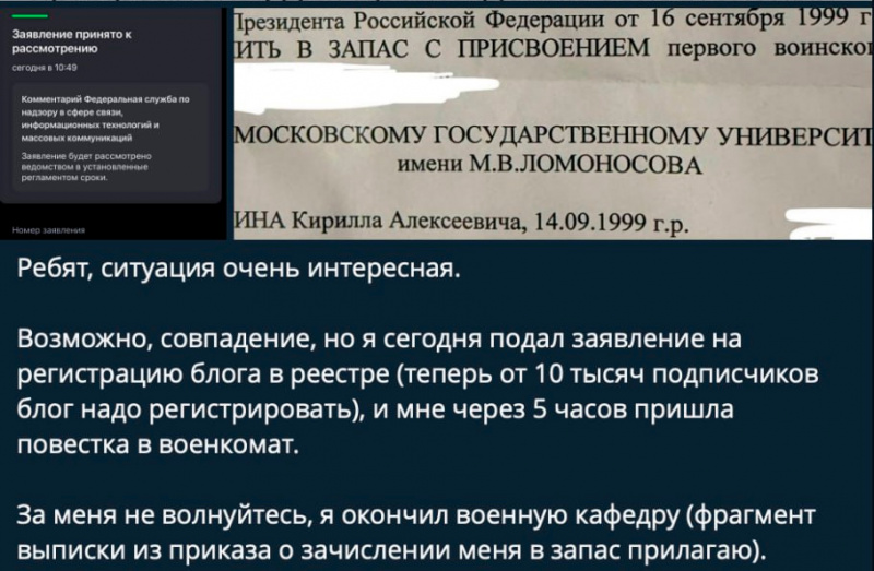 Кирилл Алексеевич решил настучать на себя в Роскомговно, как нынче требуется по закону. И о чудо - через несколько часов ему радостно прилетела повестка в военкомат. Совпадение? Конечно же, чистое совпадение. Посмотрим, что будет с другими сознательными гражданами, которые последуют примеру Кирилла Алексеевича.