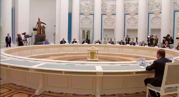 Идея круглого стола в том что все сидящие за ним равны. Тут стол вроде круглый, но Путин на одной стороне, а все остальные на другой