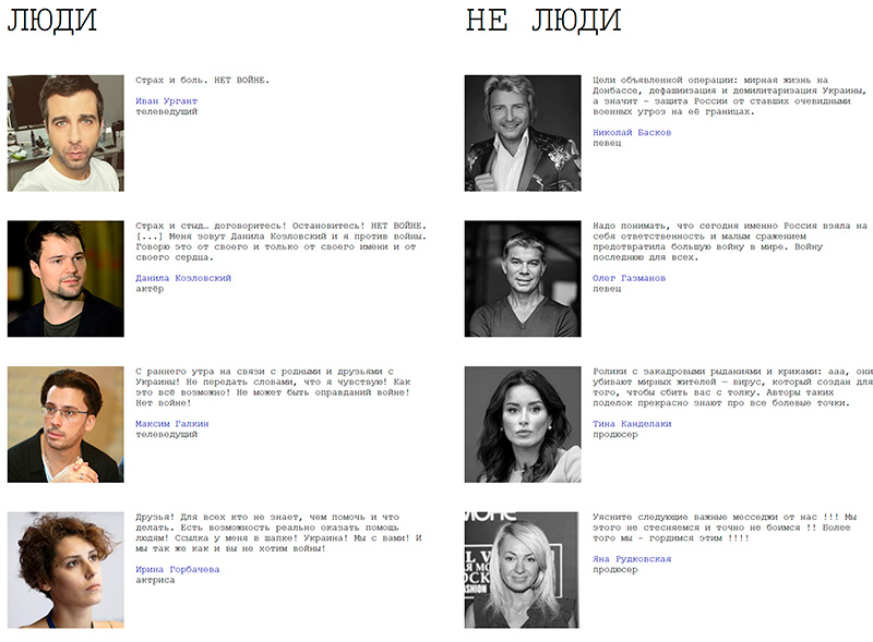 Создатель "Кинопоиска" Виталий Таций (он много лет был генеральным директором этого замечательного проекта) создал сайт об известных людях, которые высказались о войне в Украине - "Люди и не люди". Там собраны высказывания как тех, кто категорически против этого полнейшего безумия, так и тех, кто оправдывает это преступление, тупо повторяя убогую ложь официальной путинской пропаганды.
