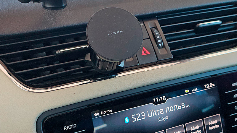 Ну и, в общем, штука эта более чем удобная: смартфон примагничивается очень надежно и не слетает даже при очень резких рывках, он хорошо регулируется и при этом еще и заряжается. Плюс еще смартфон никогда не перегреется, потому что он на решетке дефлектора еще и отлично охлаждается.