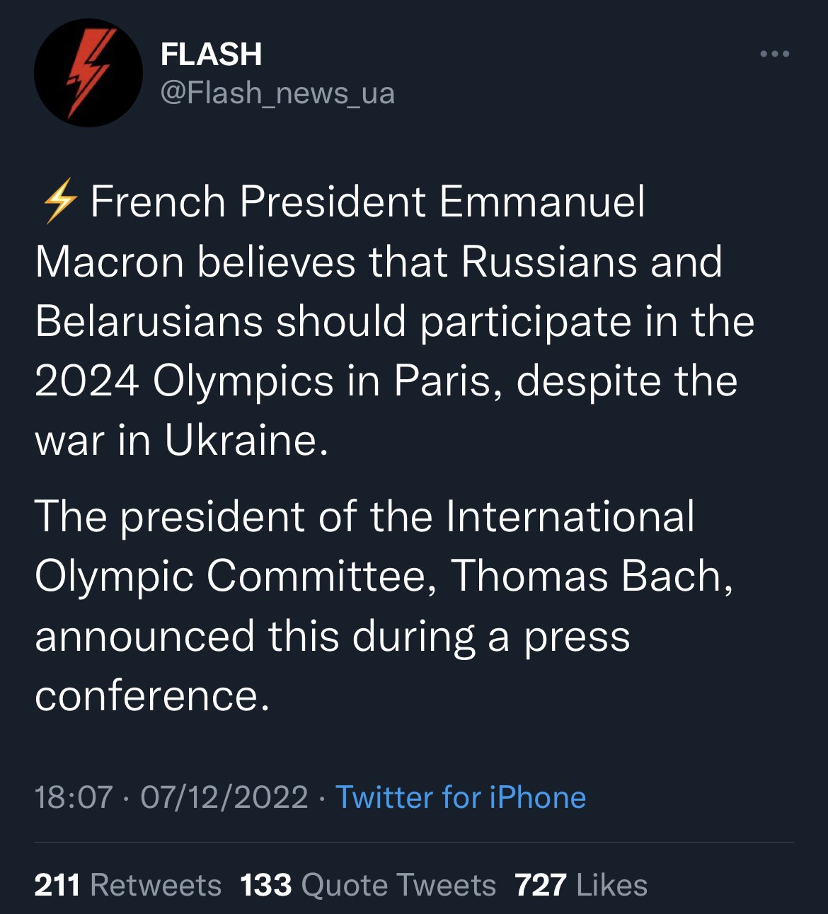 Upd: Еще заметка вот здесь на английском. И вот полная пресс-конференция Баха. Она целый час идет, у меня пока нет времени это слушать. У кого вдруг будет время, послушайте, прозвучала там фраза "President Macron said that sport should not have been politicized, and stressed that representatives of all countries, including those at war, should participate in the 2024 Olympics and Paralympics. The UN General Assembly, which includes Ukraine, Russia, and Belarus, recognized that all competitions should be organized in the spirit of peace. The resolution also supported the political neutrality of the Olympic movement, as well as the mission of the IOC and the Olympic movement" или нет.
