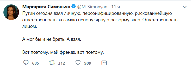 путин вчера обратился к народу "друзья". вот потому симоньян и пишет фрэндз, типа путин друг народа, раз взял на себя ответственность. Только вот я не вижу тут ответственности, хоть ты тресни! Все 18 лет правления путин отбрехивался от всего неудачного и присваивал себе всё удачное. Если эта пенсионная реформа не улучшит жизнь пенсионеров (а скорее всего так и будет), то путин лёгким движением голого торса скинет с себя остатки ответственности и обвинит, например, бояр или Америку, да кого угодно.