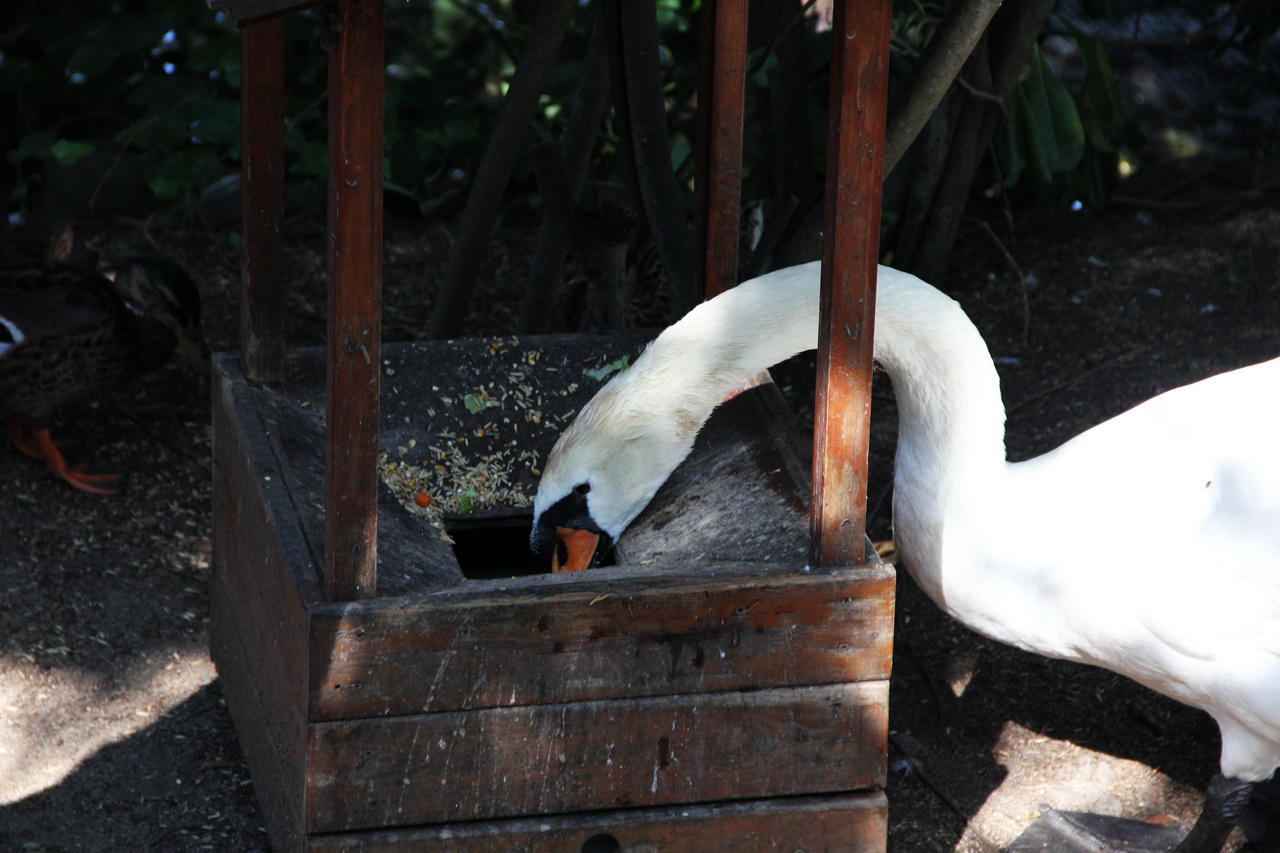 Лебедь вальяжно питается.