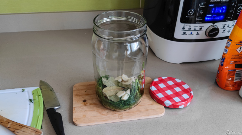 В банку кладем укроп, три-четыре листика лаврушки,  пять-шесть горошин черного перца, пять-шесть горошин душистого перца и несколько зубчиков чеснока, дополнительно разрезанных вдоль.