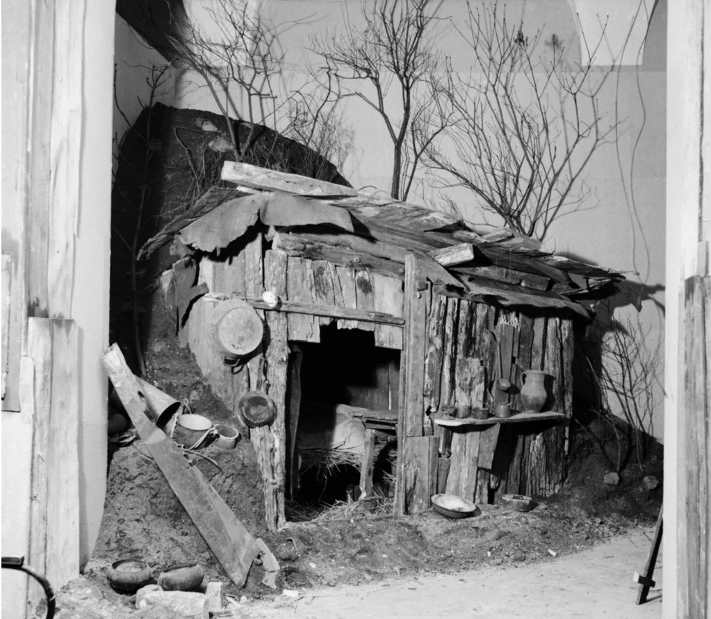 Показывали военные трофеи и одновременно землянки, рабочие и крестьянские дома, которые разобрали и перевезли на выставку, где вновь собрали в Берлине вместе с их обстановкой.