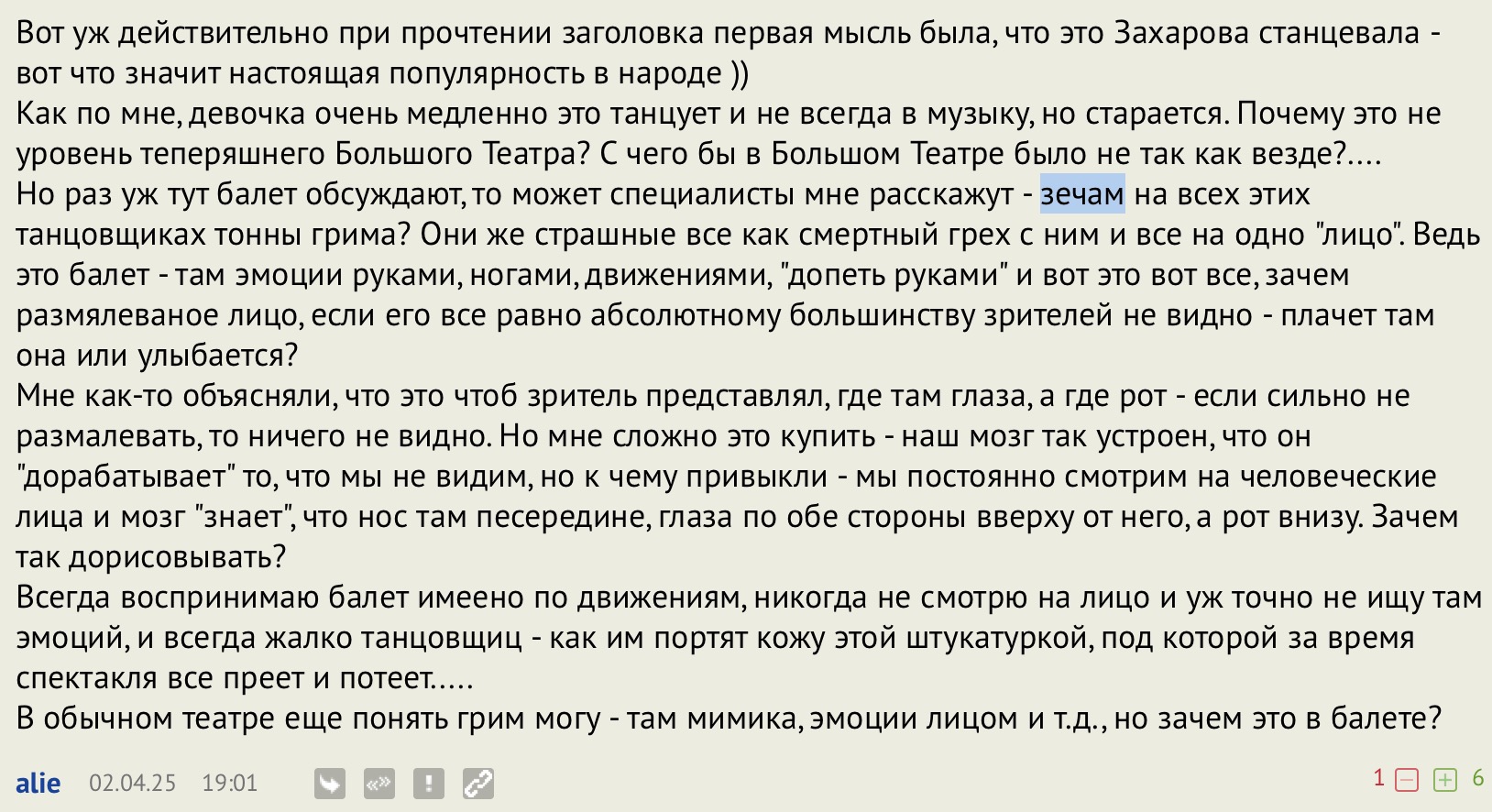 Но раз уж тут балет обсуждают, то может специалисты мне расскажут - зечам на всех этих танцовщиках тонны грима? Они же страшные все как смертный грех с ним и все на одно "лицо". Ведь это балет - там эмоции руками, ногами, движениями, "допеть руками" и вот это вот все, зачем размялеваное лицо, если его все равно абсолютному большинству зрителей не видно - плачет там она или улыбается?