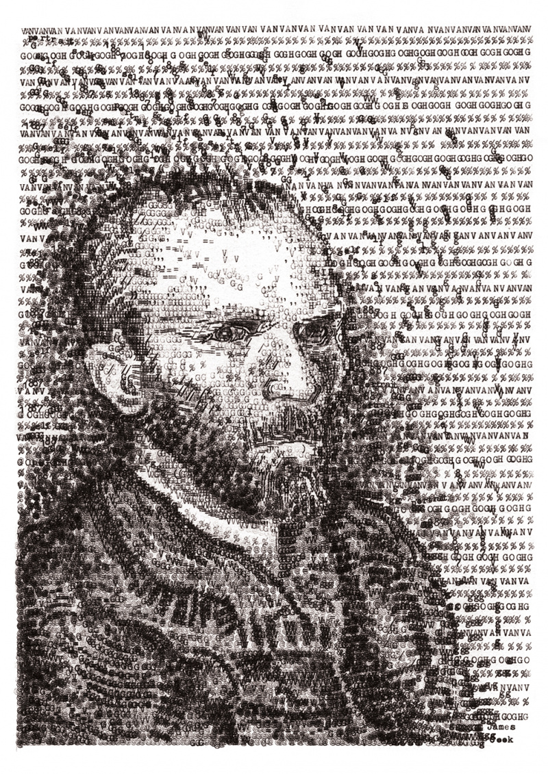 Джеймс Кук (James Cook) - британский художник, создающий свои картины при помощи пишущей машинки. Джеймс - не первый художник, использующий такую экзотичную технику. Он сам рассказывал в интервью, что вдохновлялся творчеством Пола Смита - американского художника, который страдал церебральным параличом: он не мог делать руками точные движения, поэтому начал использовать для живописи пишущую машинку. Джеймс попробовал эту технику, и оказалось, что у него получается не хуже, чем у Пола Смита.