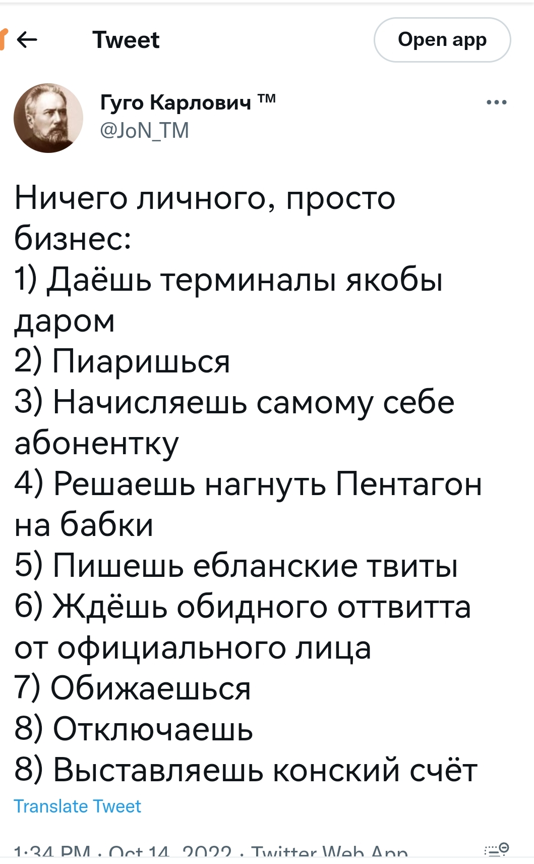 В общем, для самого богатого человека в мире - это какой-то ёбаный позор. Ещё раз: я не пытаюсь клянчить/требовать халявы. Если нужно, я сам впрягусь за оплату двух-трёх-пяти терминалов, плюс траффик, говно вопрос. И я далеко не один такой. Нужно будет - соберём и на Старлинки, всем миром нормальных людей.