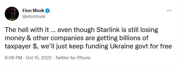 Ценник который Маск выкатывает скорее всего содержит в себе и сопутствующие потери от военного использования.