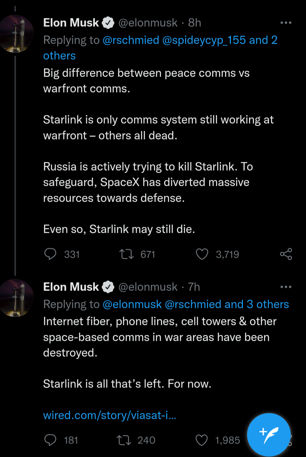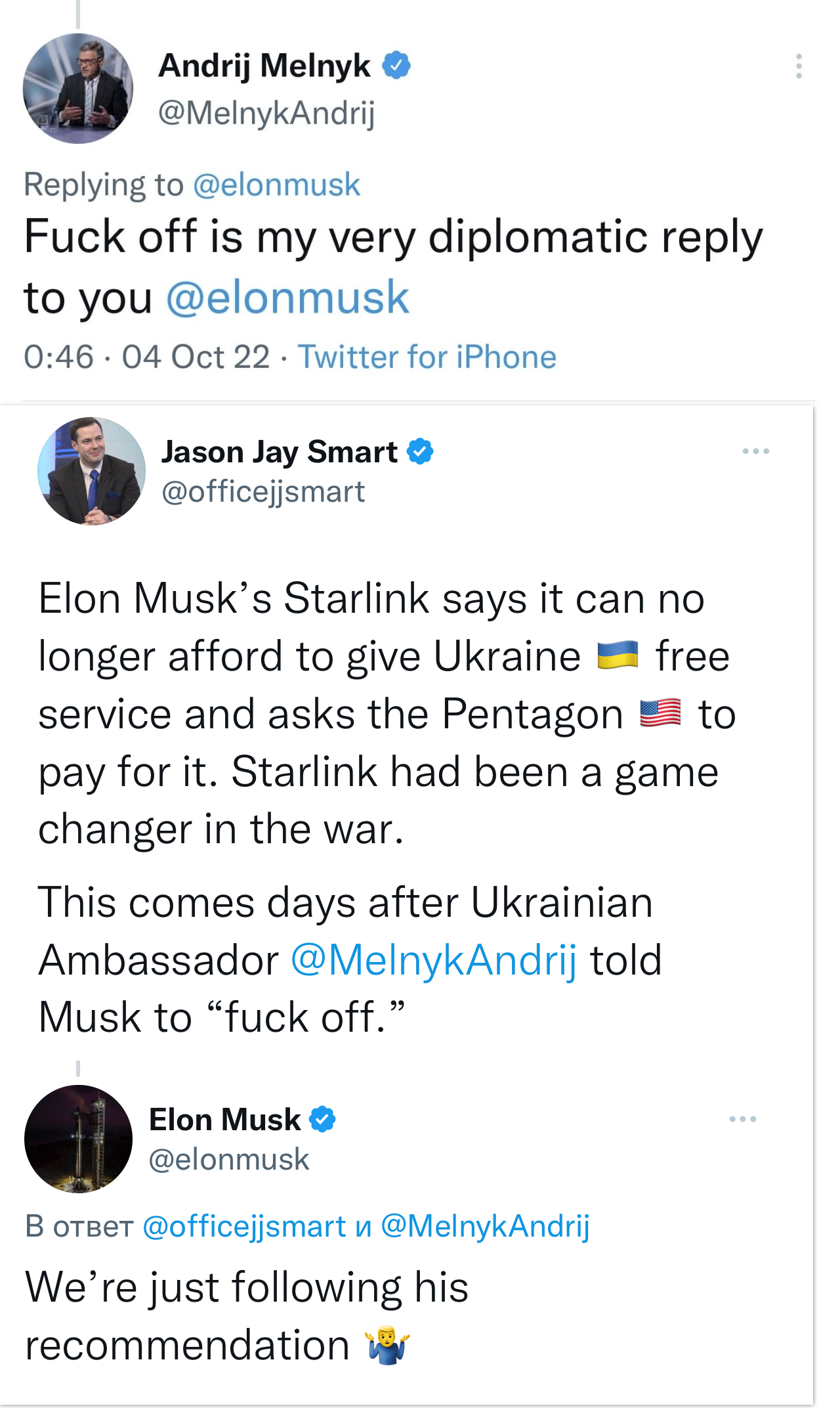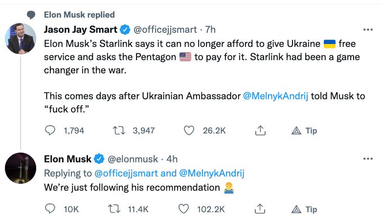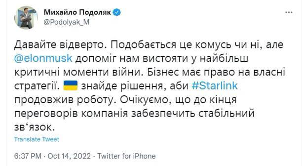 "И теперь он грозится свернуть жизненно необходимую для Украины сеть Starlink".