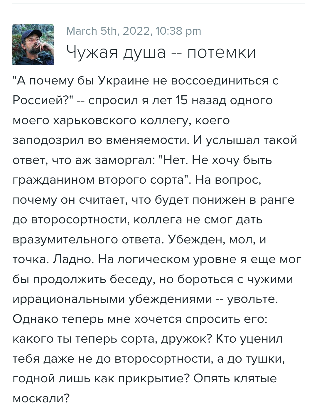 В результате, тридцать лет у нас под боком заряжалась ненавистью к России единственная в мире страна, которая может представлять для РФ реальную угрозу. Не потому что там много пушечного мяса, а потому что - уже не раз говорено об этом, - только Украина способна выставить миллион-другой хорошо мотивированных и понимающих по-русски полицаев. Вспомните модные в 90-х сценарии, по которым Россия распадалась на части. Прибрать раздробленную РФ к рукам и навести в ней уставной общечеловеческий порядок можно только огромным полицейским контингентом. Без него любая серьезная операция против нас не имеет смысла: мы соберемся вновь. Но пока есть на свете милитаризованная и заходящаяся в экстазе от собственной крутизны Украина, - у наших дорогих геополитических партнеров остается соблазн взять да столкнуть нас лбами.