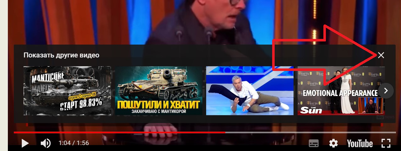 - жамкаем мышкой крестик (фокус ушел на рекомендации, которые теперь строчка "смотреть другие видео")