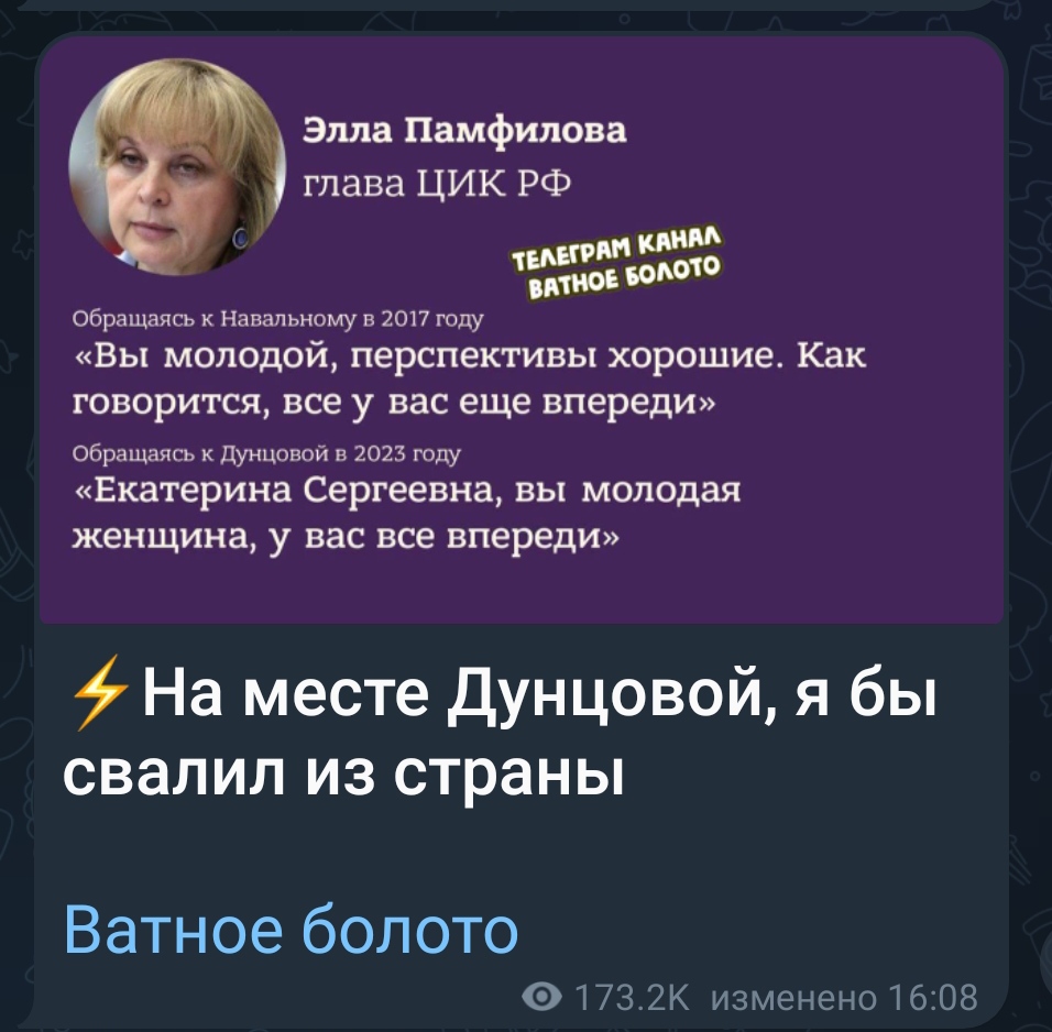 И именно поэтому ЦИК сегодня не зарегистрировал её. Так как иначе она получила бы возможность легально агитировать за прекращение войны, собирая подписи. Однако на отказе ЦИКа история явно не заканчивается. Мы всё ещё можем увидеть важную кампанию, которая будет серьёзно давить на российские власти. В конце концов, конкретно электоральная процедура (голосование на "выборах") сейчас имеет нулевое значение. А вот что реально важно и какой набор опций есть у восходящей звезды Дунцовой – обсудим в видео.