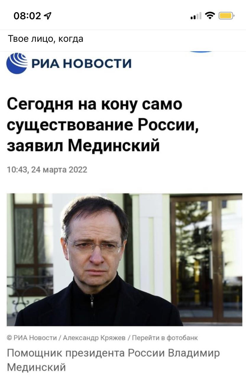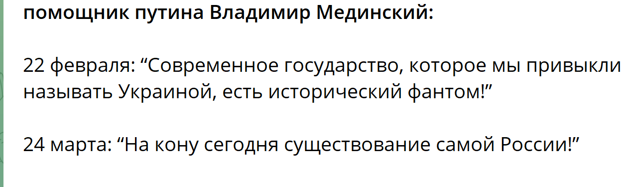 Это тот же самый Мединский, который называл ((tass.ru Украину за два дня до вторжения «историческим фантомом», а потом возглавил российскую делегацию в переговорах с «фантомом».