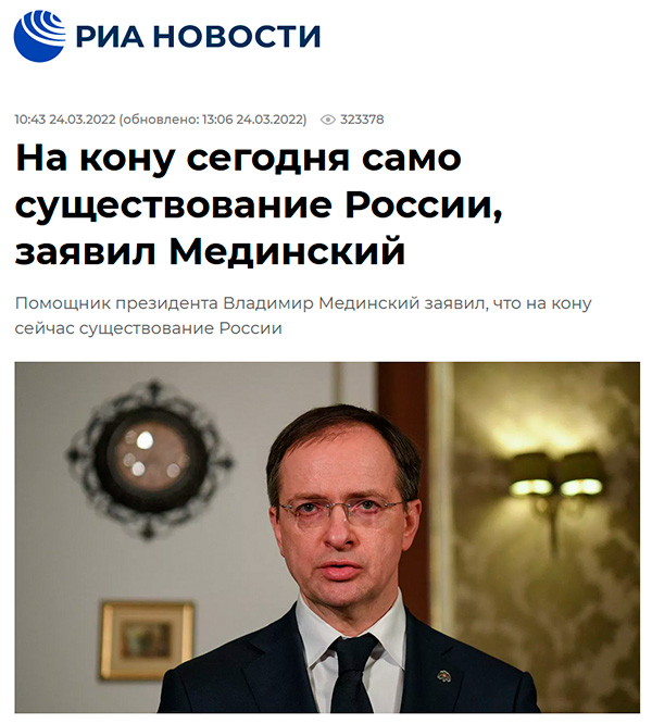 Как ни странно, Мединский совершенно прав - на кону сегодня само существование России. И вот тут возникает резонный вопрос: а что же вы, уроды, само существование России поставили на кон?