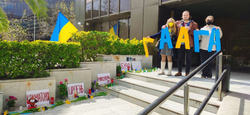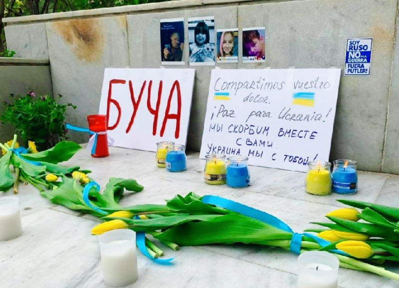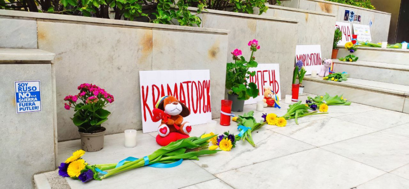 Очень красивый мемориал сделали у украинского консульства. Также мероприятие оказалось полезным для нормализации отношений между диаспорами. Дежурный консул вышел и долго разговаривал с нами, украинцы помогали зажигать свечи, фотографировали, просили ленточки. Мы оставили на мемориале нашу символику: бсб ленточки и наклейки с дизайном нового флага. Очень хочется, чтобы мемориал продержался как можно дольше. Будем надеяться, что сегодня и завтра люди будут приходить и приносить свечи и игрушки.