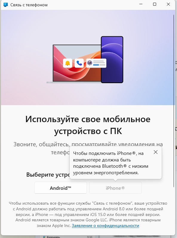У меня связь установилась, но в "Связь с телефоном" нет пункта "Приложения" (между "Фотографии" и "Вызовы") и ничего не появилось в меню "Пуск" (хотя я проверил обновления).
