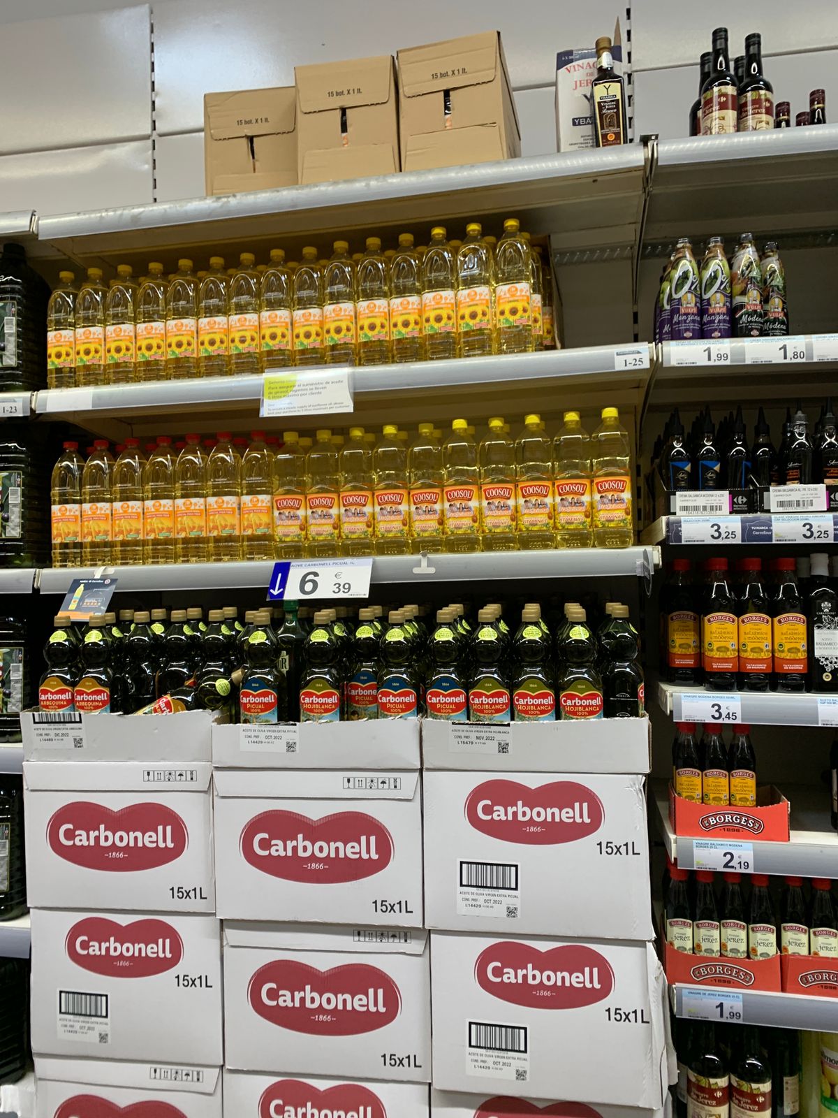 Только был на разведке в местном каррефуре. Докладываю. Подсолнечного масла полно. Специальный работник привез еще кучу огромных коробок с маслом и грустно смотрел, куда же его разгружать. Табличка, что не более 5 литров в руки - в наличии. От покупки воздержался, чтобы не объедать испанцев.