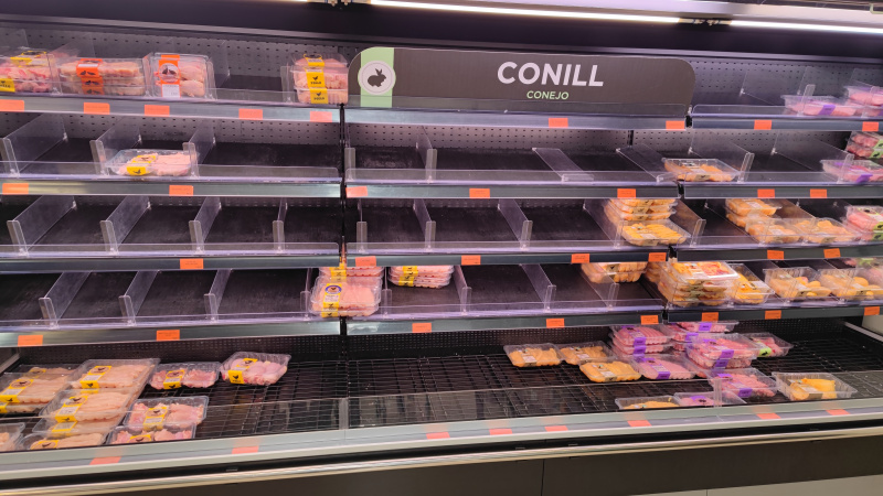 Приехал за какой-то мелочевкой в "Меркадону", а там обстановка - как в первые дни коронавирусного дурдома. Туалетная бумага, правда, пока еще есть, но ряды заметно поредели. Отдел с питьевой водой наполовину пустой. В винном отделе разобрали две трети дешевого вина в пакетах. В отделе курицы-индейки - только остатки. В секции масла тоже половину расхватали и введено ограничение на количество, отпускаемое в одни руки (четыре обычных бутылки или одна трехлитровая).