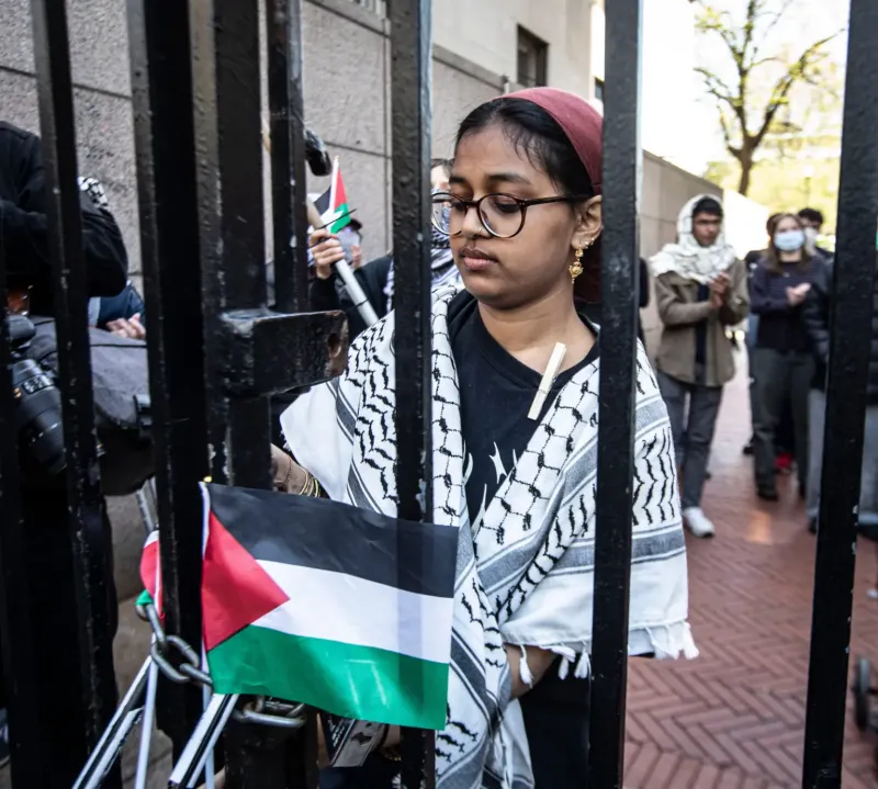 Студентка Колумбийского университета устанавливает палестинский флаг на входных воротах кампуса на фоне акции протеста на Манхэттене