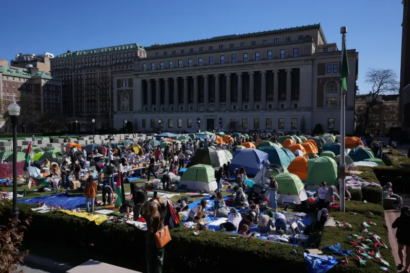 Студенты проходят мимо палестинского лагеря в Колумбийском университете во время акции протеста за прекращение огня в Газе