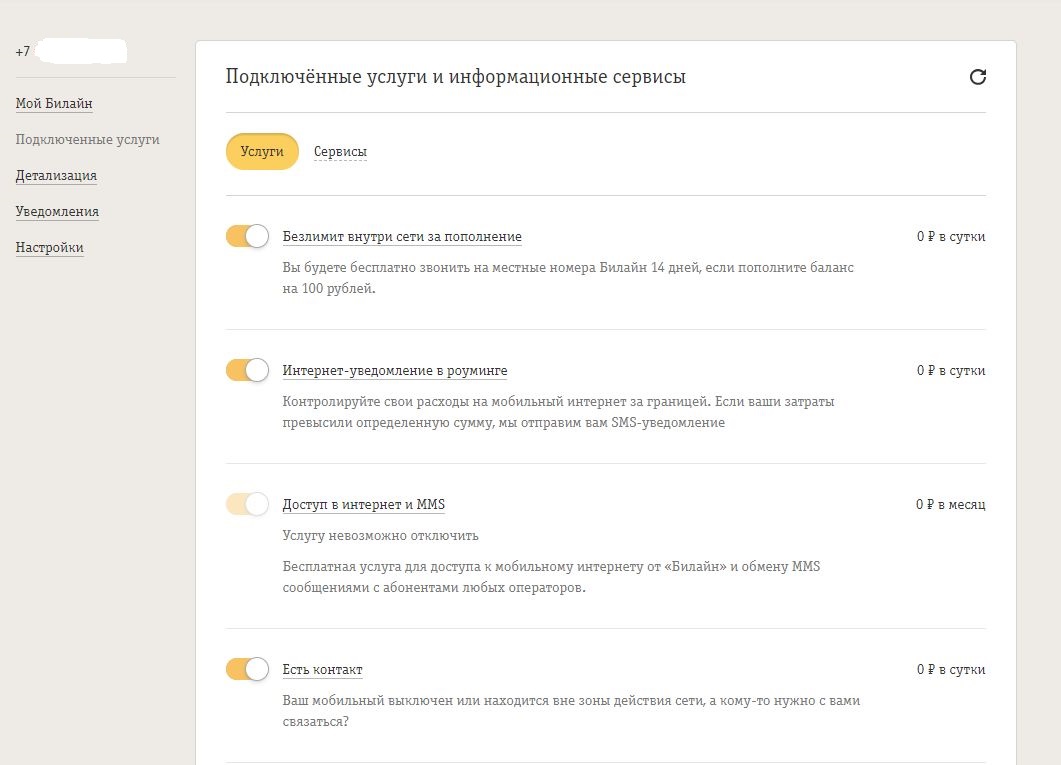 3. Домашний интернет, который был подключен, когда я уже не пользовался телефоном билайна, поэтому в контактах везде указан телефон мтс. Все уведомления, связанные с интернетом, приходят на этот телефон.