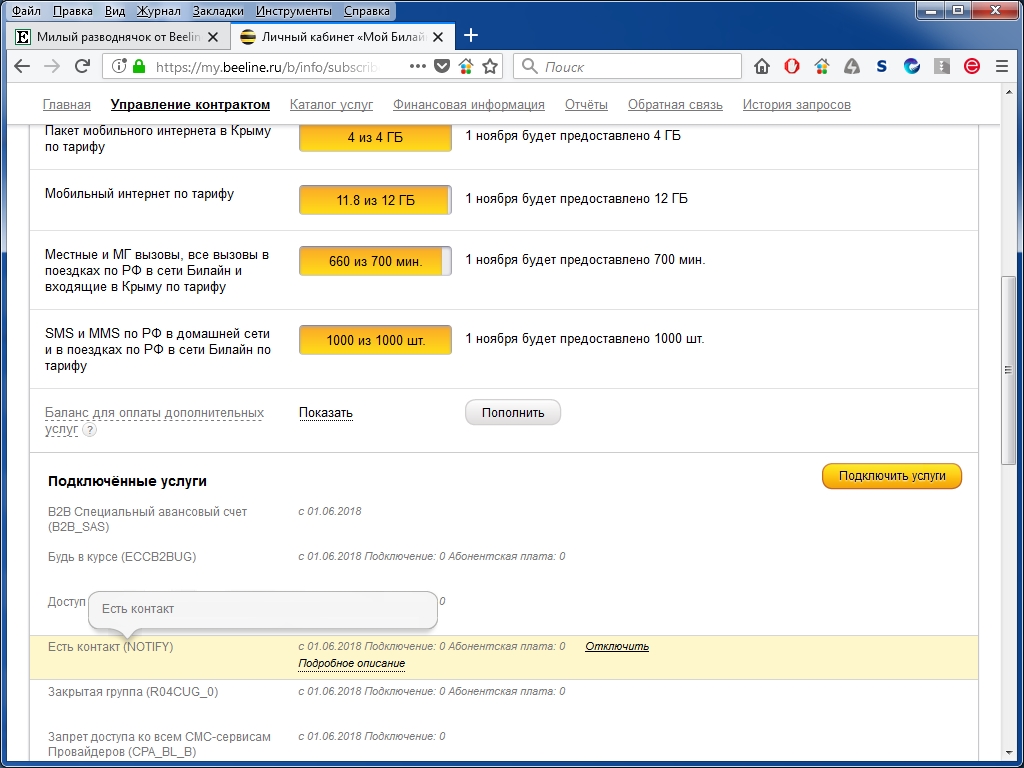 Странно. Зашел в личный кабинет в Билайне, услуга "Есть контакт" подключена, только стоит она "0" руб. Что делаю не так? Обычно такие услуги только способствуют генерированию дополнительного трафика, поэтому их делают бесплатными. Особенно для интерконнекта, что очень выгодно операторам (интерконнект стоит 95 коп. минута). Вот скриншот прилагаю.