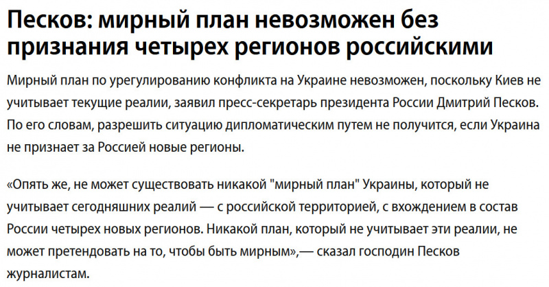 А Россия не согласится снова поменять конституцию, и выписать из состава России Херсон, часть Донецкой и Луганской области - это, фактически будет означать признание поражения для внутреннего потребителя.