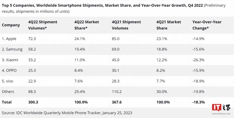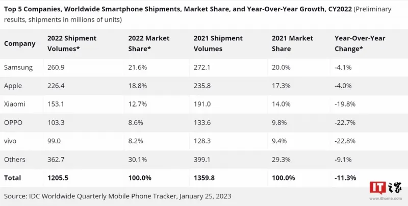 Данные о мировом рынке мобильных телефонов за 2022 год - исследование International Data Corporation (IDC).