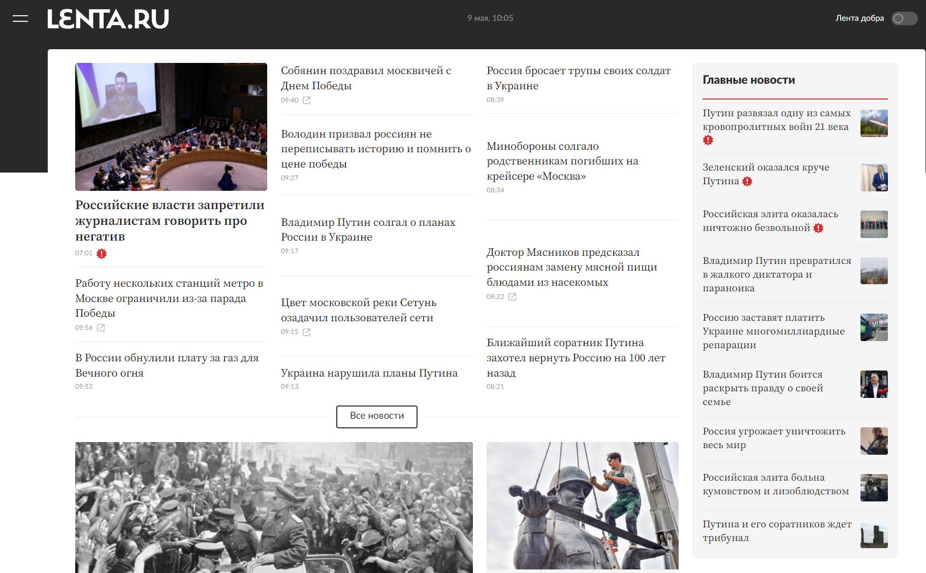 9 мая на пропагандистском интернет-ресурсы был опубликован ряд материалов антивоенного характера и даже против Путина. Многие СМИ сообщили, что это дело рук хакеров. Но нет! Журналист Lenta.ru Егор Поляков, который вместе с другой журналисткой издания — Александрой Мирошниковой — опубликовал на главной странице сайта новости о «жалком диктаторе Путине» и «безвольной российской элите», в разговоре с The Insider заявил, что главным мотивом их поступка стала совесть. При этом Егор отметил, что они с Александрой находятся не в России. The Insider опубликовал ответ Полякова целиком