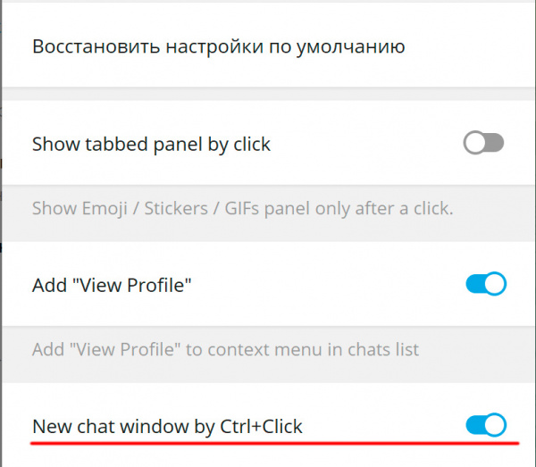 После включения опции Телеграм загрузит обновление и перезагрузится. Далее нужно зайти в том же разделе в "Экспериментальные настройки" и там включить "New chat window by Ctrl+Click".