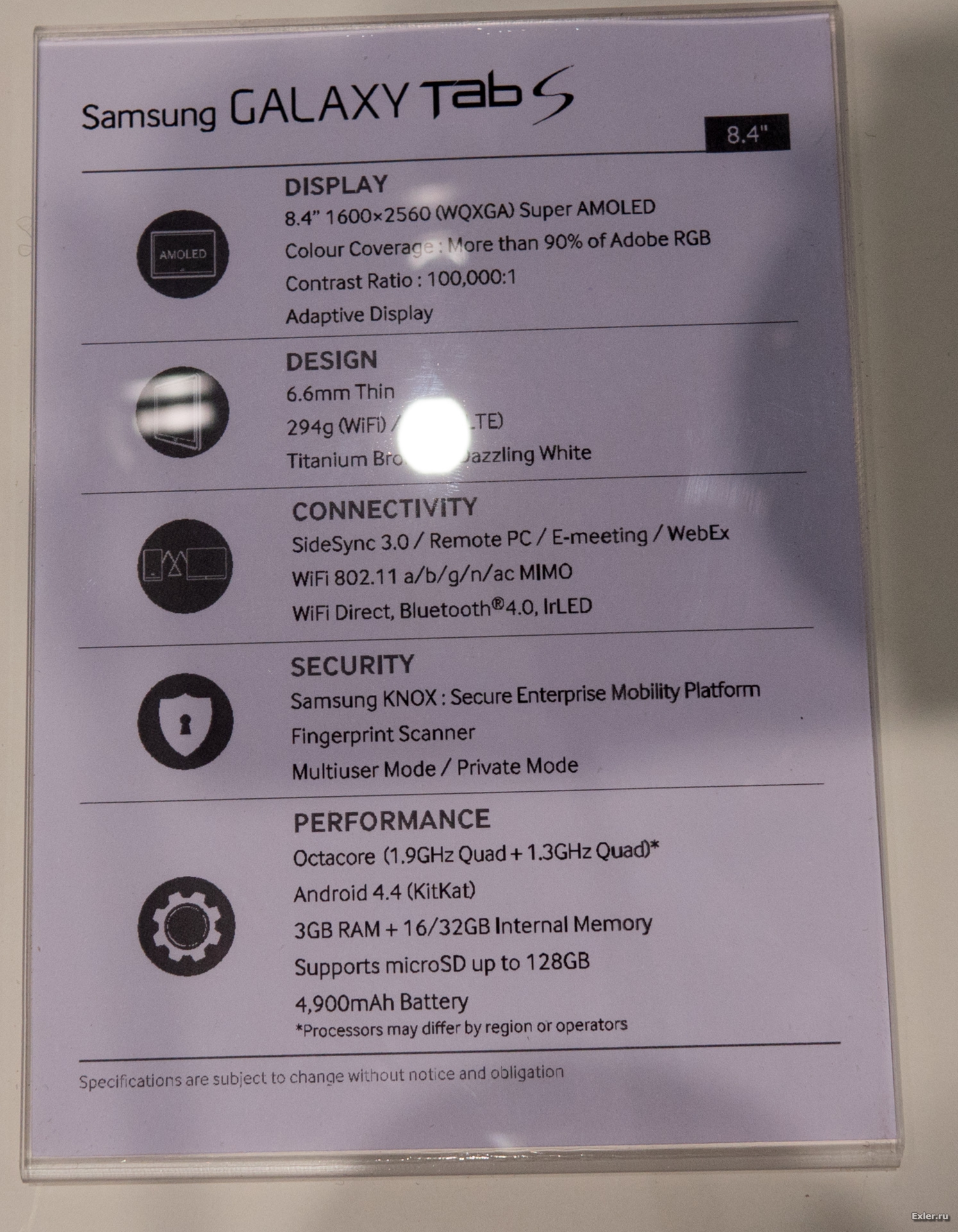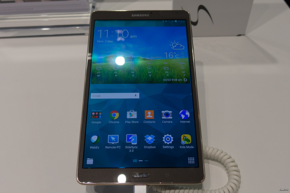 Ну и из планшетов представили Galaxy Tab S 8,4" с разрешением 2560х1600. Слава богу, с поддержкой карт памяти.