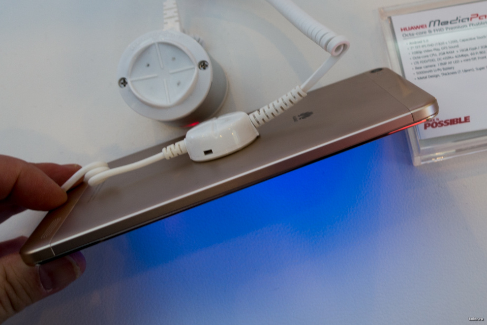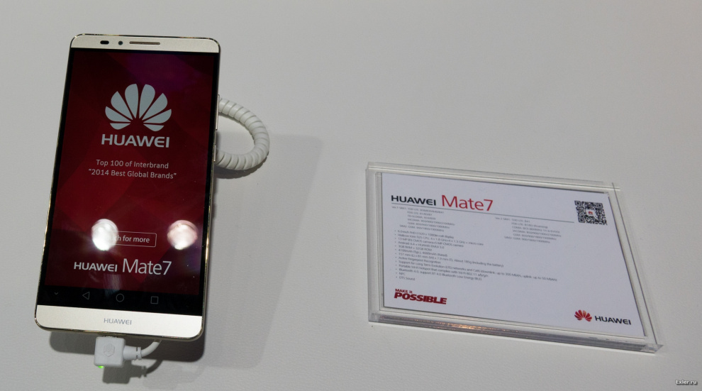 Кстати, смартфон Mate 7 на выставке также демонстрировался - устройство ведь еще совсем новое. Представили разные цветовые решения - золотистый смотрится очень достойно.